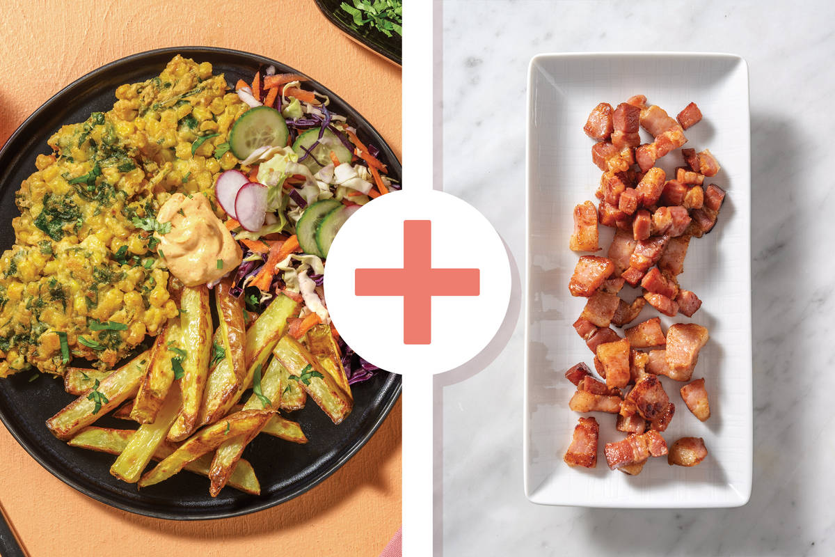 • Divide fries, creamy cucumber slaw and Mexican bacon and corn fritters between plates. • Garnish with reserved coriander. • Serve with smokey aioli. Enjoy!