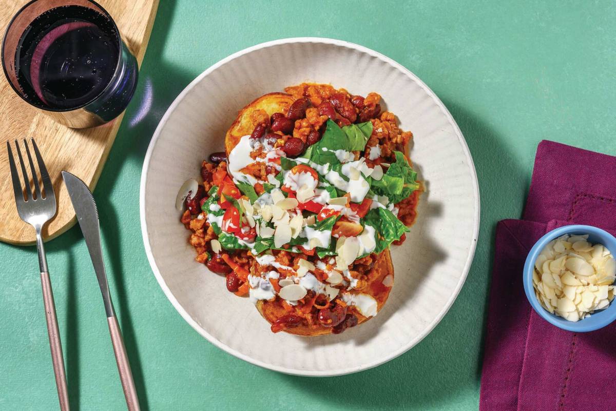 • Divide jacket potatoes between bowls. • Top with Mexican plant-based mince and bean chilli. • Spoon over tomato ensalada and drizzle over plant-based mayo. • Sprinkle over toasted almonds to serve. Enjoy!
