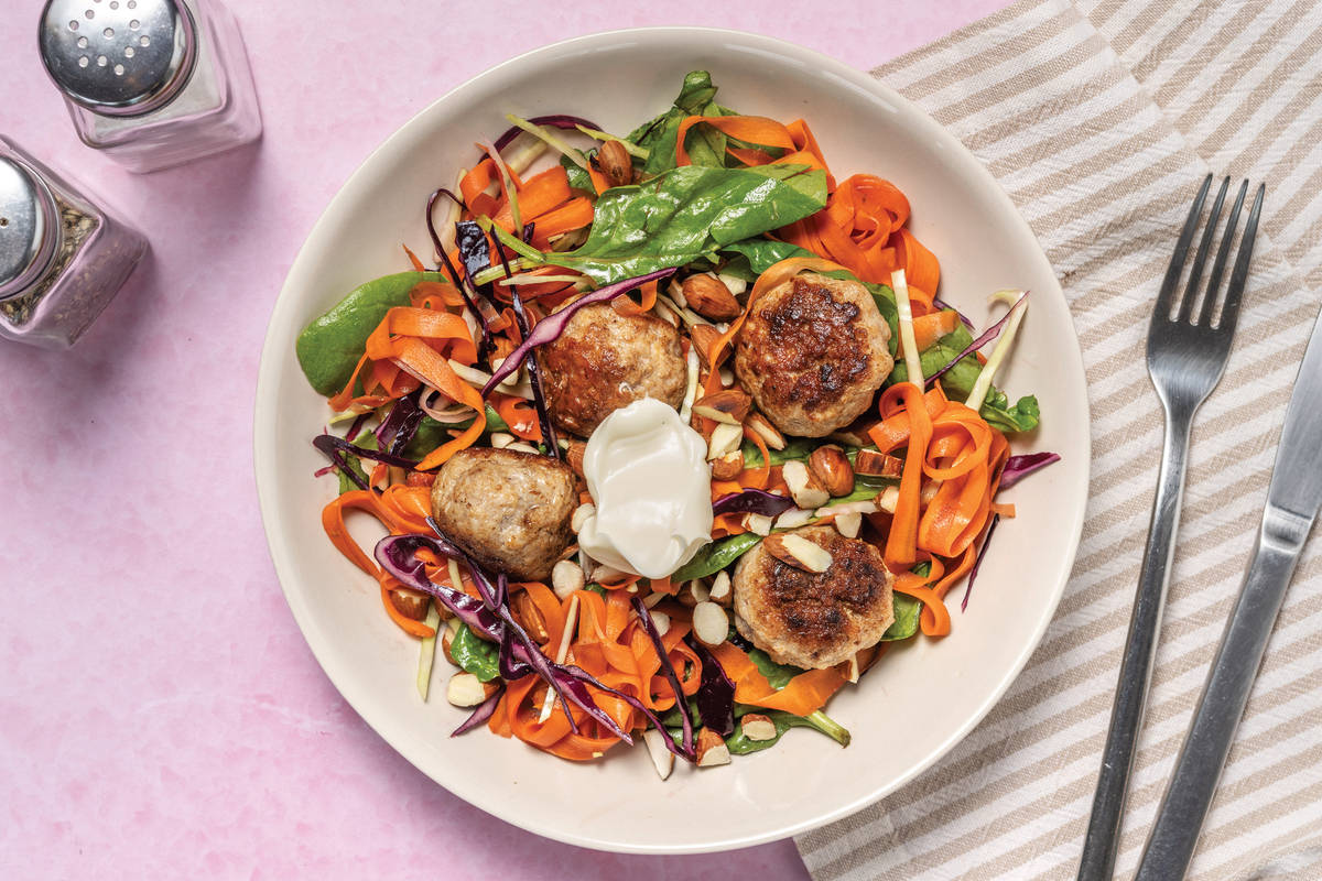 • Divide carrot noodle salad between bowls. • Top with Middle Eastern pork meatballs and dollop over garlic aioli. • Garnish with toasted almonds to serve. Enjoy!