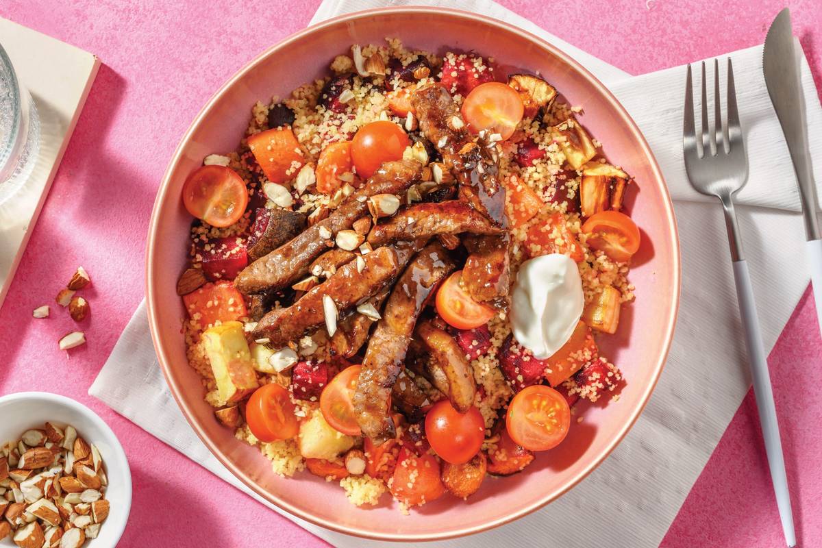 • Roughly chop roasted almonds. Halve cherry tomatoes. • To the couscous, add roasted veggies, cherry tomatoes and a drizzle of vinegar and olive oil. Season with salt and pepper and stir to combine. • Divide veggie and cherry tomato couscous between bowls. • Top with Moroccan honey beef and Greek-style yoghurt. • Garnish with almonds to serve. Enjoy!