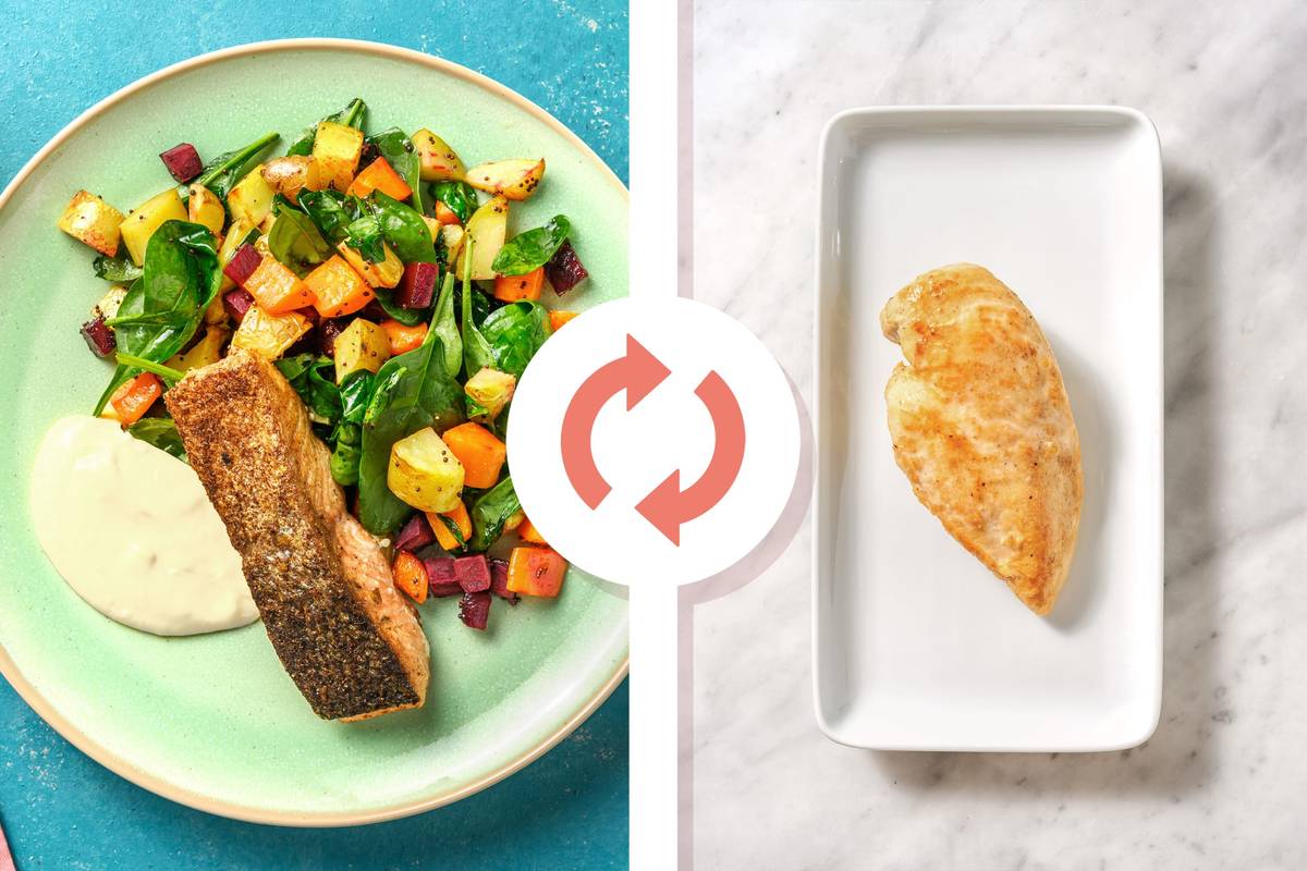 Custom Recipe: If you've swapped to chicken breast, place your hand flat on top of chicken and slice through horizontally to make two thin steaks. Combine chicken with spice blend as above, turning to coat. When veggies have 5 minutes remaining, heat the frying pan and oil as above. Cook chicken until cooked through, 3-5 minutes each side.