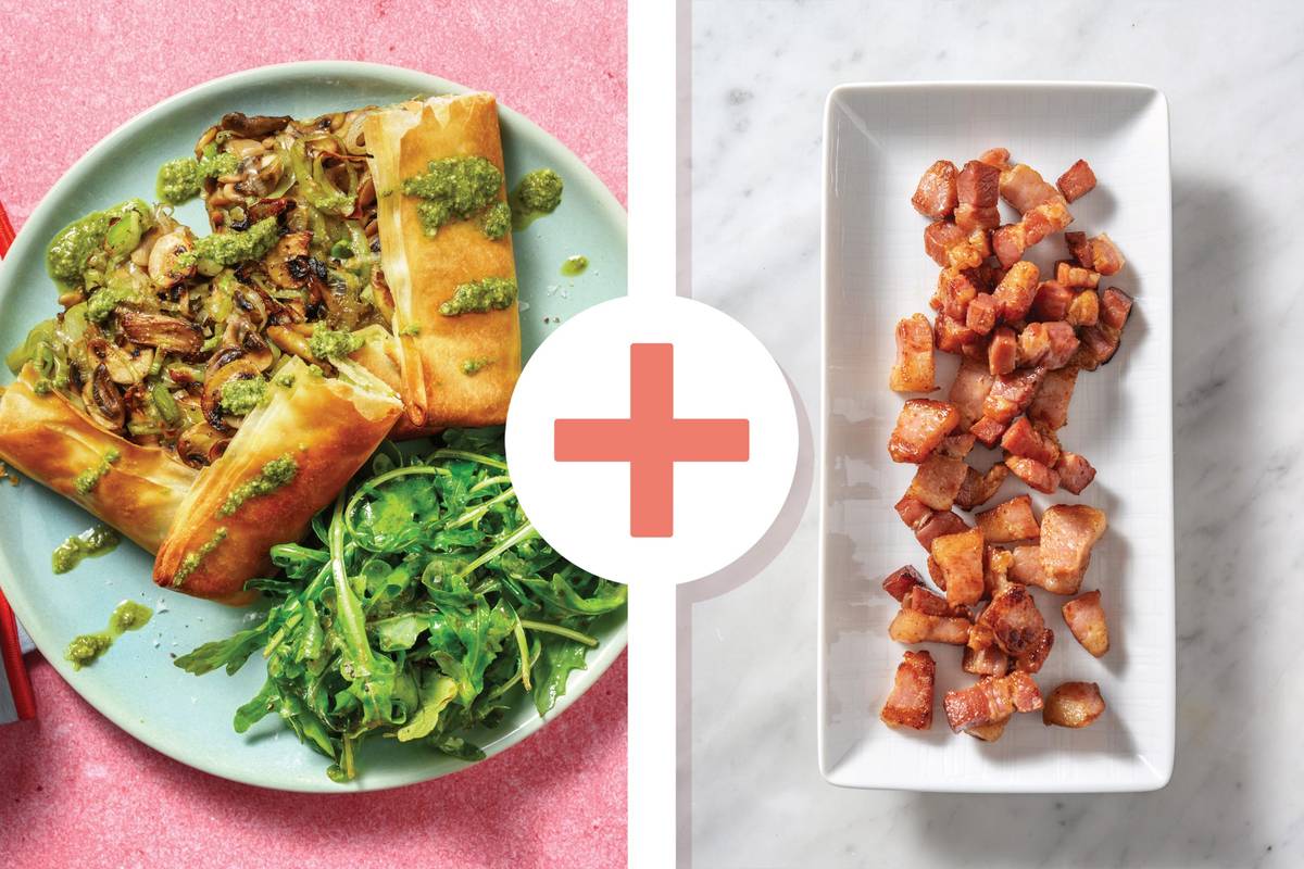 • Slice mushroom, bacon and potato galette. Divide galettes between plates. • Drizzle over plant-based basil pesto. • Serve with mixed salad. Enjoy!