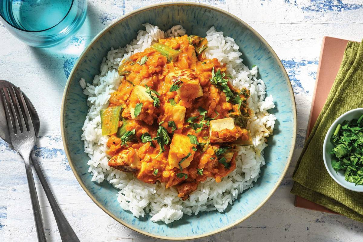 In a large saucepan, heat a drizzle of olive oil over a medium-high heat. Cook the onion and carrot until softened, 4-5 minutes. Add the ginger and mild North Indian spice blend. Cook, stirring, until fragrant, 1 minute. Add the water (for the dhal), coconut cream, tomato paste and the vegetable stock powder. Stir to combine.