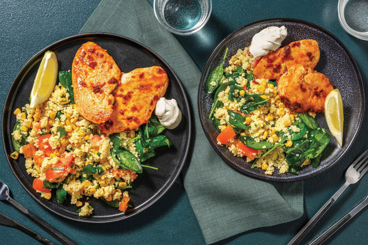 While the chicken is cooking, add the baby spinach leaves, tomato, coriander and couscous to the charred corn. Add a squeeze of lemon juice and a drizzle of olive oil, then toss to combine. Season to taste.