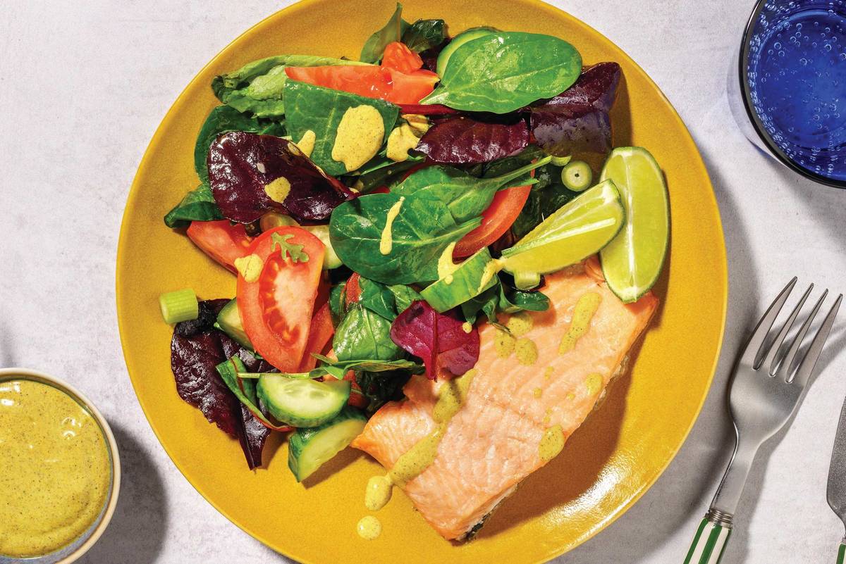 This vibrant meal is a celebration of fresh, flaky salmon. It doesn’t take much for it really shine - we’ve paired it with a fresh and crunchy spring onion-speckled salad. Don’t forget the golden yoghurt though - a dusting of curry powder and a drizzle of honey really boost the flavour of this creamy accompaniment. *This recipe is under 650kcal per serving*