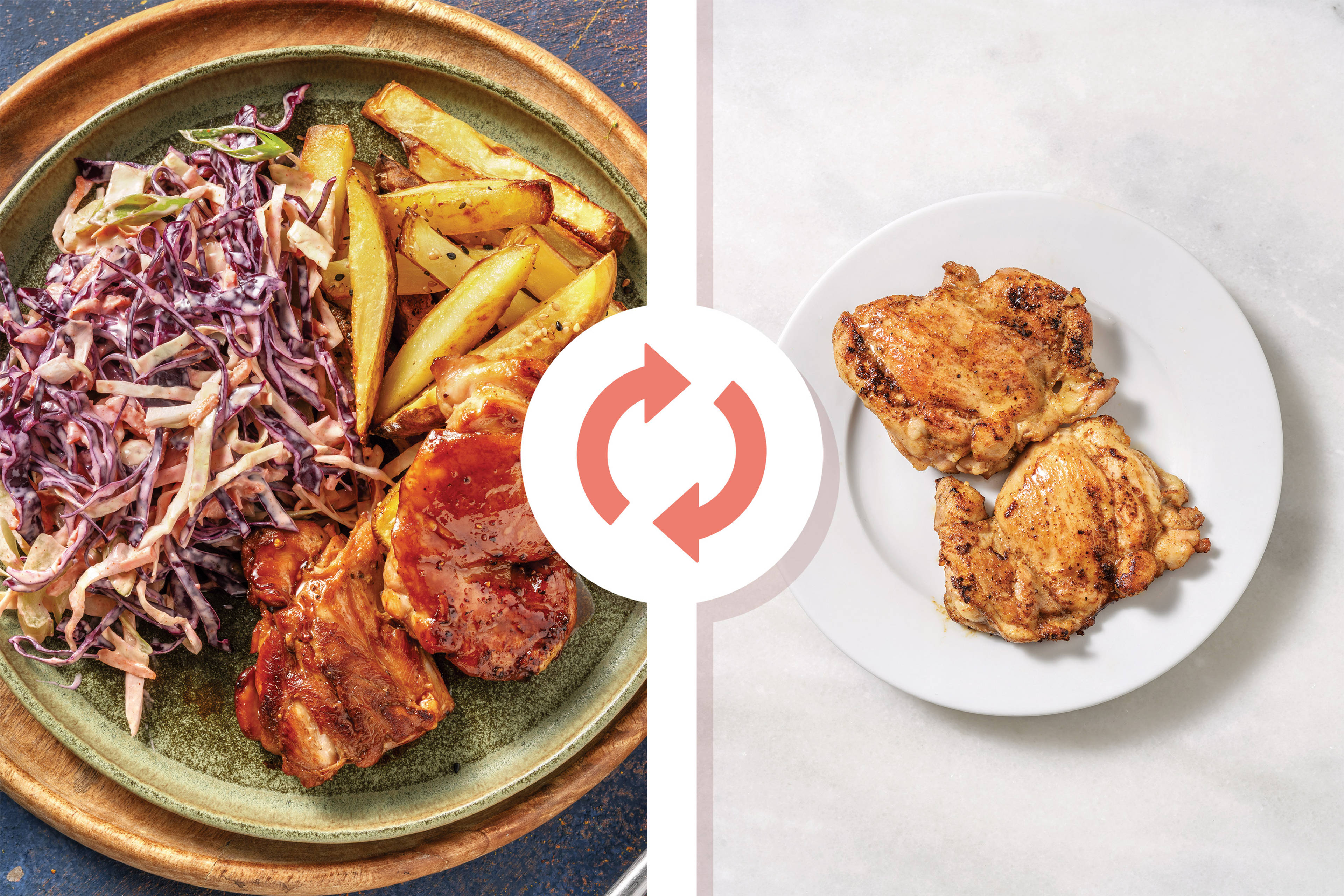 • Divide plant-based chicken tenders, potato wedges and creamy corn slaw between plates. Top chicken with beetroot relish. Enjoy!