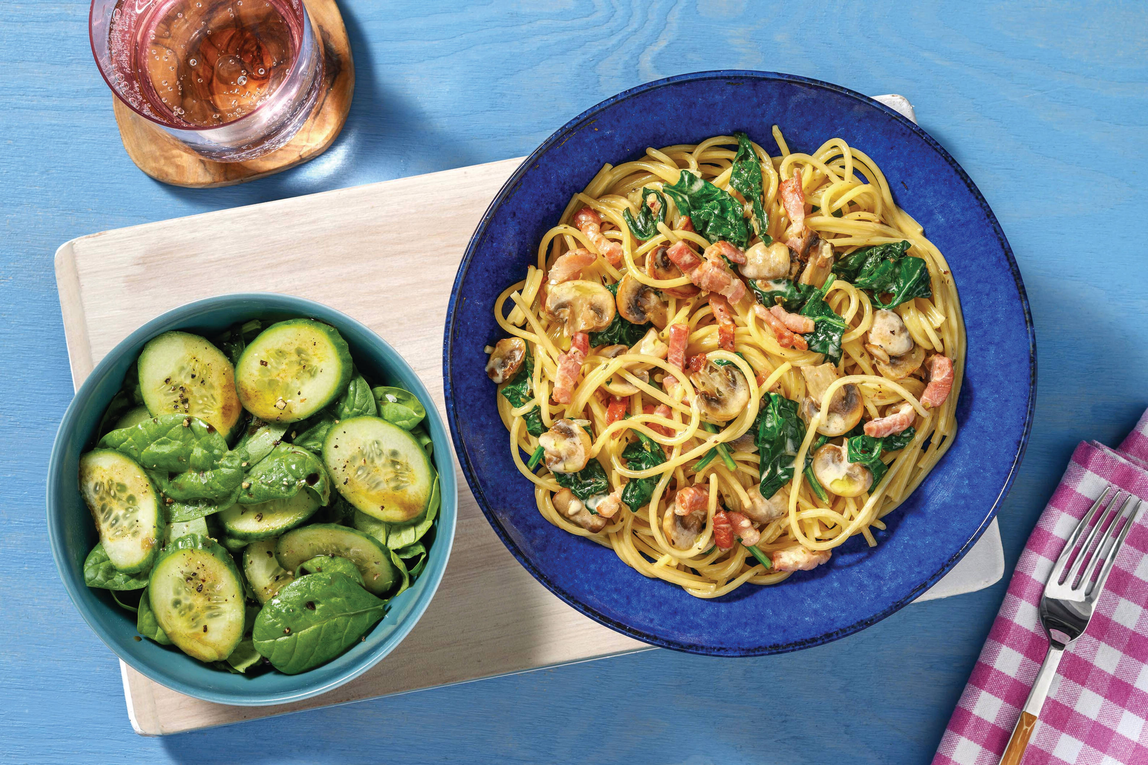 • Divide plant-based pumpkin ravioli and creamy bacon-spinach sauce between bowls. • Sprinkle over a pinch of chilli flakes (if using) to serve. Enjoy!