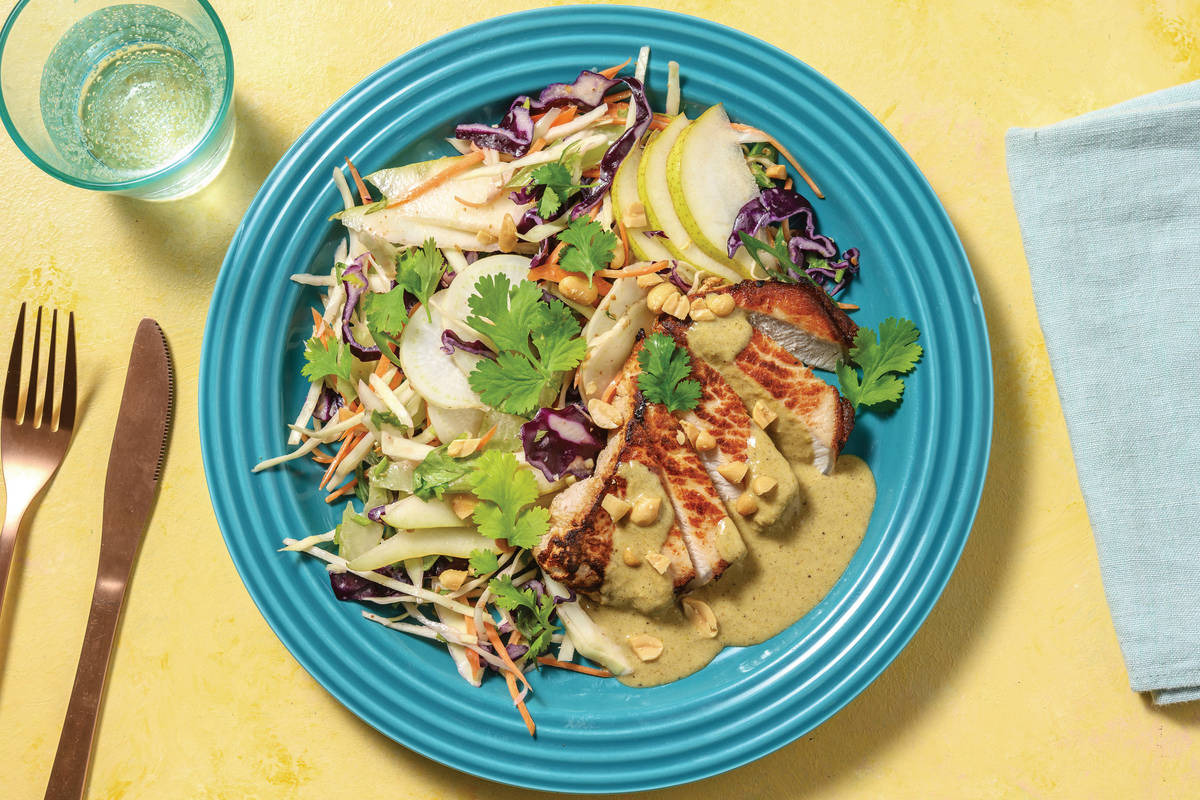 • In a bowl, combine slaw mix, pear, turnip, ponzu and Japanese dressing. Season • Slice pork • Divide slaw and pork between plates. Drizzle pork with coconut sauce • Serve with peanuts and torn herbs