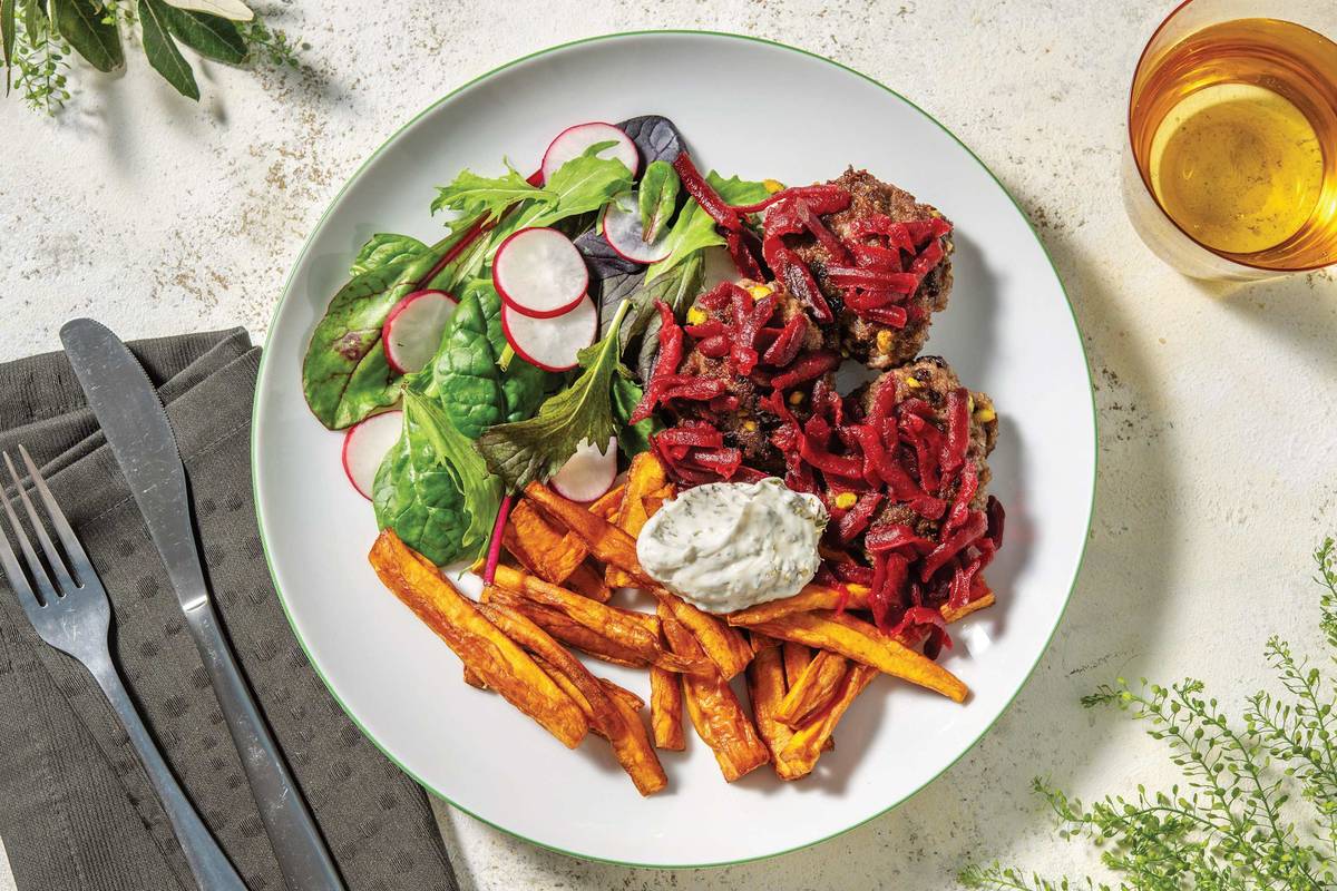 • Meanwhile, combine radish, avocado, mixed salad leaves and a drizzle of vinegar and olive oil in a second medium bowl. Season to taste. • Divide beef, currant and almond rissoles, avocado salad and potato fries between plates. • Top rissoles with beetroot relish. • Serve with dill & parsley mayonnaise. Enjoy!