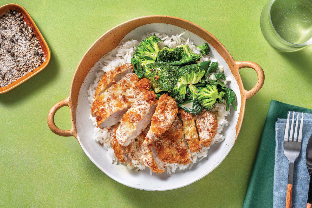 We've turbo-charged schnitzel night with some unexpected, yet delightful additions! You'll find a too-good-to-be true creamy coconut sauce infused with Mumbai-style spices, some fluffy rice and a helping of garlic veggies. With immaculate combos like these, it's nothing but happy days ahead!