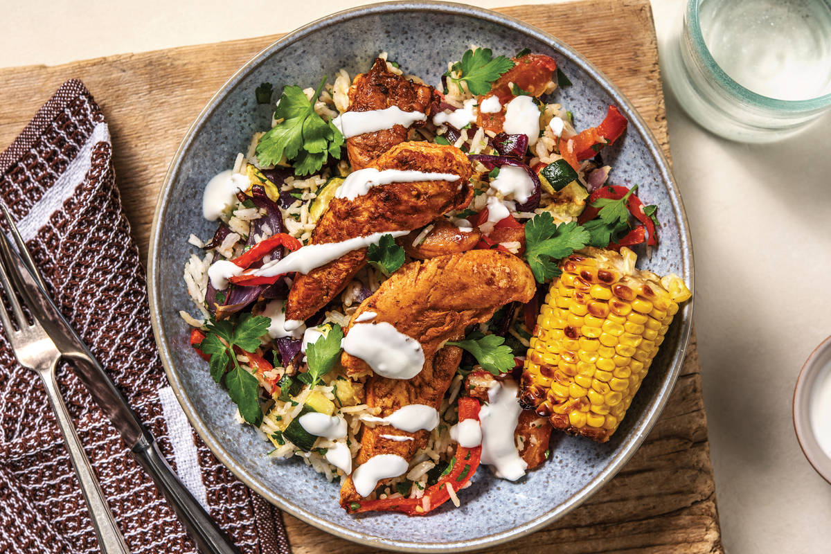 Divide the roasted veggie garlic rice between bowls. Top with the Portuguese chicken strips and corn cobs (spread with a little butter if you like). Top with the smokey aioli and reserved parsley leaves. Serve with the remaining lemon wedges.