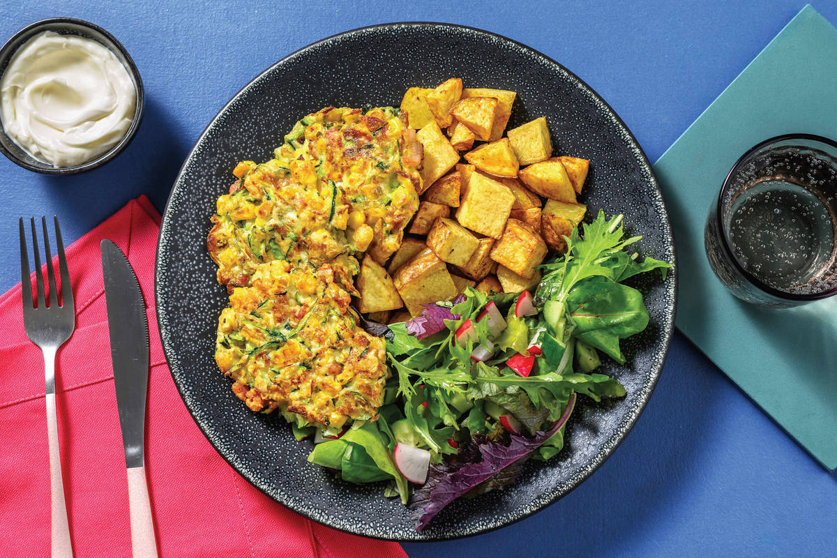 • Preheat oven to 240°C/220°C fan-forced. Cut potato into bite-sized chunks. • Place on a lined oven tray. Drizzle with olive oil, season with salt and toss to coat. Roast until tender, 20-25 minutes. • Meanwhile, in a large frying pan, heat a drizzle of olive oil over medium-high heat. Cook diced bacon, breaking up with a spoon, until golden, 4-5 minutes. • While the bacon is cooking, grate courgette, then squeeze out any excess moisture using paper towel (this will help the fritters crisp up in the pan!). Drain the sweetcorn.