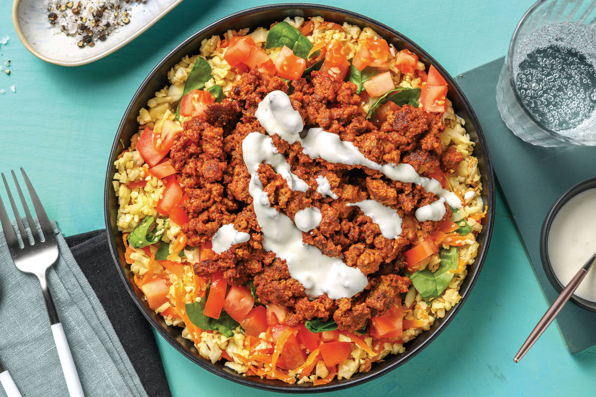 • Divide cauliflower rice toss between bowls. • Top with onion chutney and chermoula beef. • Drizzle with garlic yoghurt to serve. Enjoy!