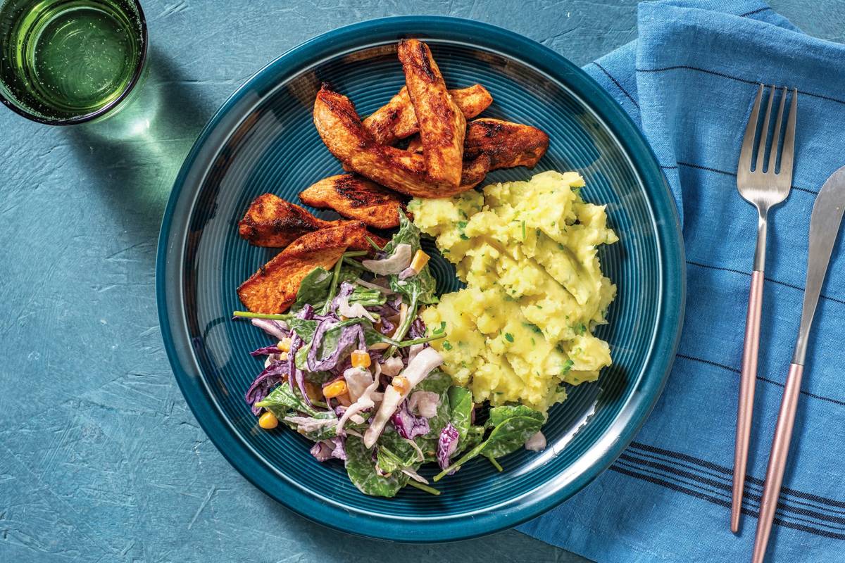 • Roughly chop cucumber. • In a second medium bowl, combine shredded cabbage mix, cucumber, baby spinach leaves, mayonnaise and a drizzle of olive oil. Season to taste. • Divide spiced chicken strips and garlicky smashed potatoes between plates. • Serve with creamy spinach slaw. Enjoy!