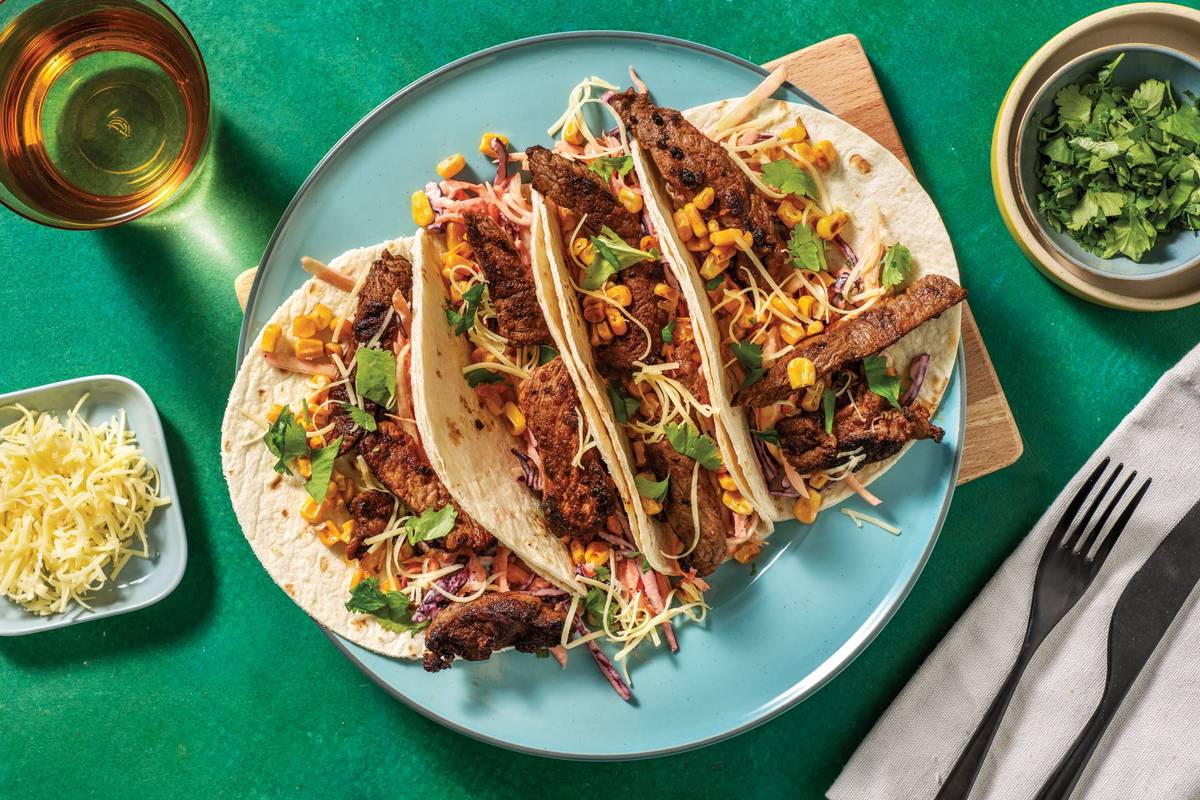 • Bring everything to the table to serve. Top each tortilla with creamy slaw, Tex-Mex beef strips and shredded Cheddar cheese. • Tear over coriander to serve. Enjoy!
