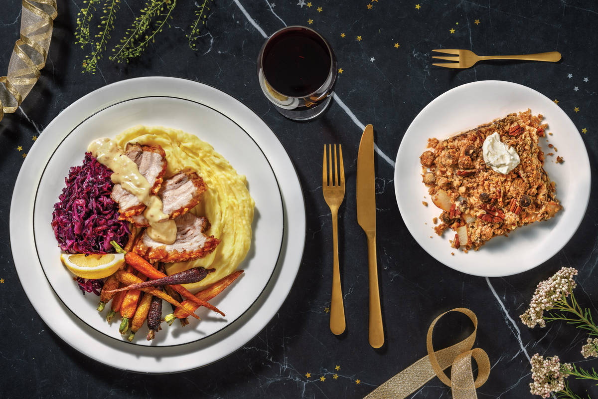 Get ready for a bit of bliss on a fork because it’s roasted pork belly tonight. The zesty lemon stirred through the creamy potato mash and a serving of nutty rainbow carrots really helps to send your tastebuds to their happy place. To download the recipe card for the main and dessert, click the download arrow on the right of the screen.