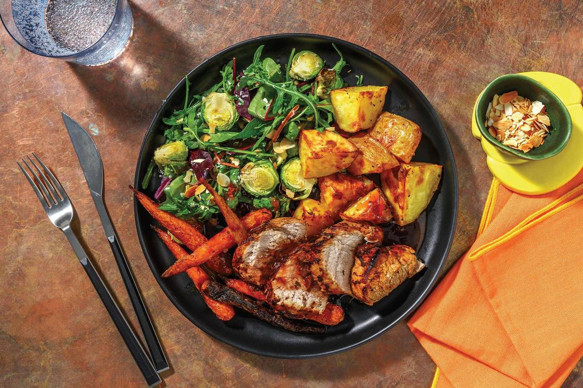 • Preheat oven to 240°C/220°C. Boil the kettle. • Cut potato into large chunks. • Halve Brussels sprouts. • In a medium bowl, combine tenderised pork fillet, Aussie spice blend, a pinch of salt and a drizzle of olive oil.
