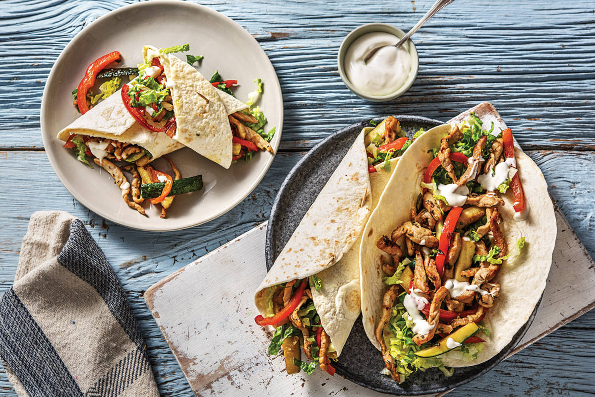 Divide the classic wraps between plates and fill with cos lettuce, chargrilled veggies and rosemary pork. Drizzle with aioli and roll up!