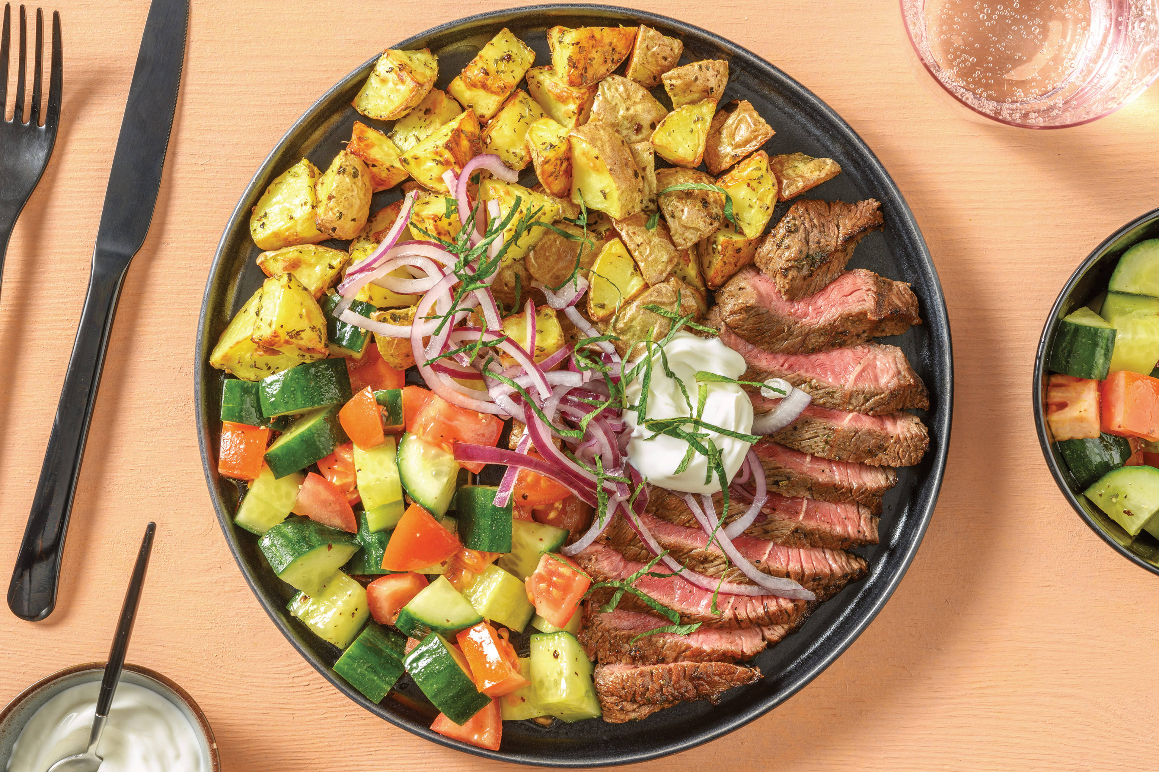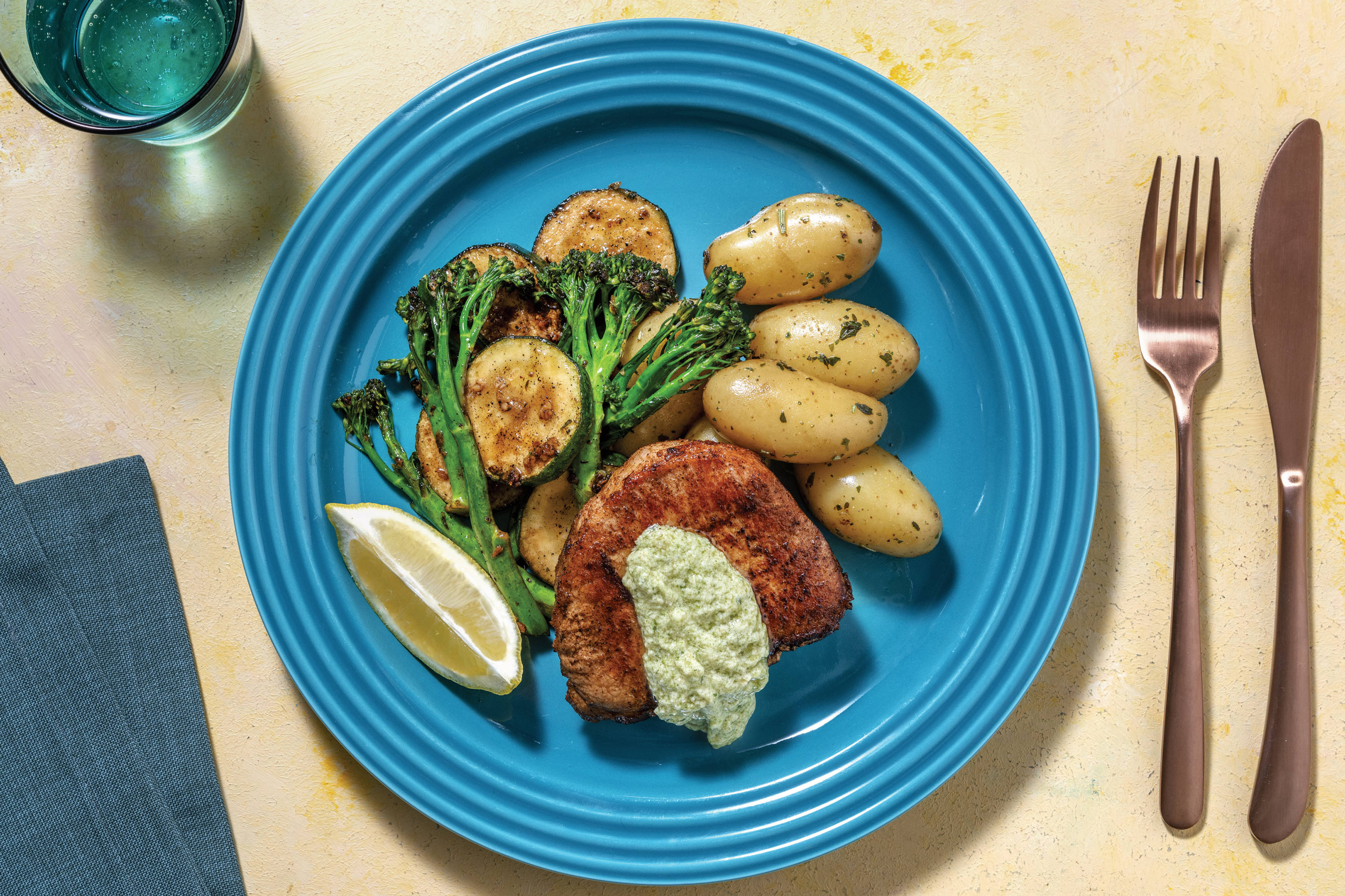 • Chop courgette and silverbeet • Place beef between two sheets of baking paper. Pound with rolling pin until slightly flattened (this ensures it’s extra tender!) • Heat olive oil in frying pan over high heat. Season beef • Cook beef, turning, for 5-6 mins or until cooked to your liking • Halfway through cooking steak, add courgette and cook until softened. Transfer to a plate to rest