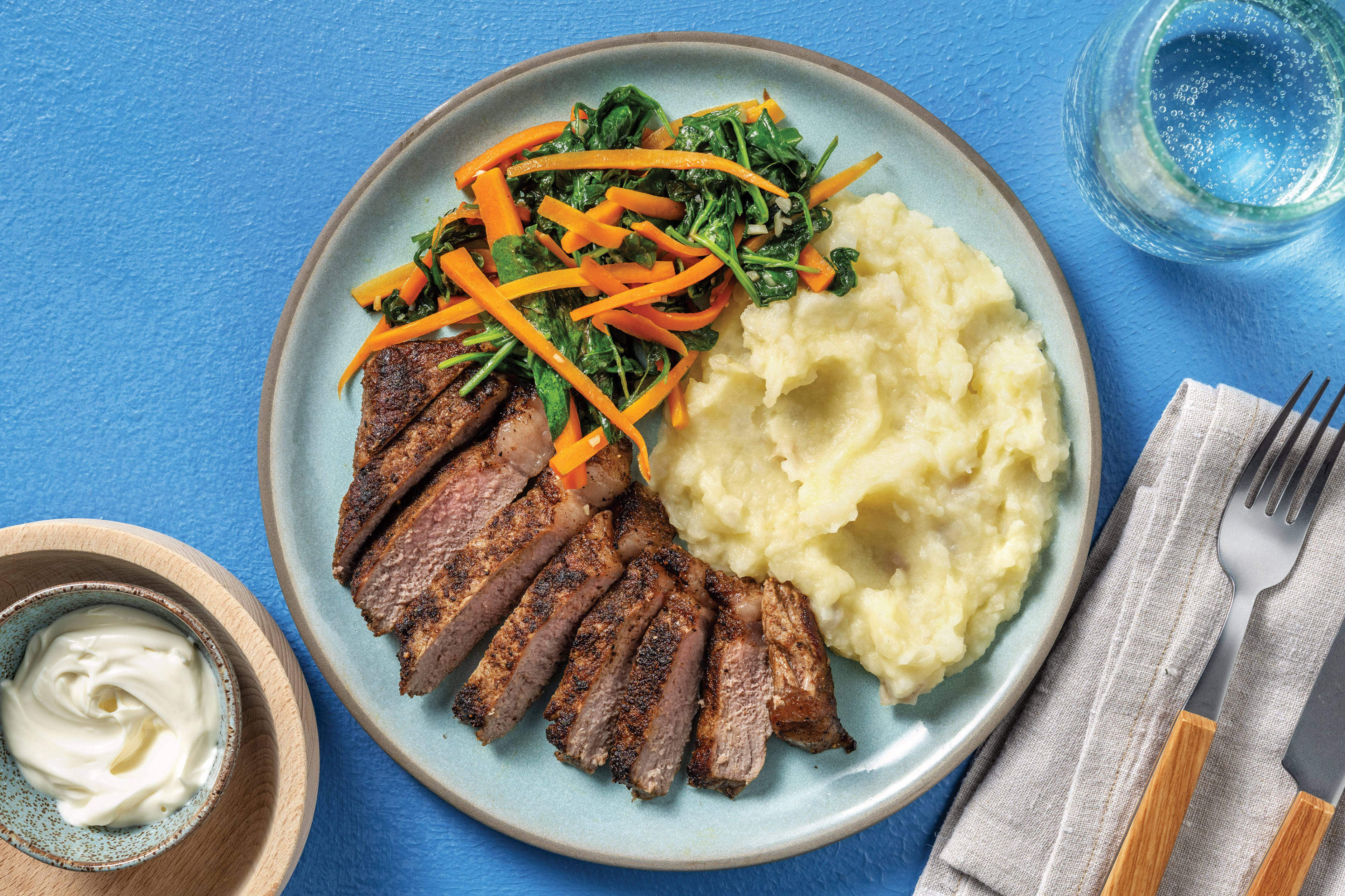 • Meanwhile, transfer mashed potato to a heatproof bowl • Microwave until hot and steaming, 3 mins. Season to taste • Slice steak. Plate up mash, steak and veggies • Spoon over peppercorn sauce to serve