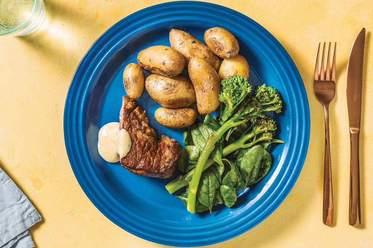 • Meanwhile, prick a few holes in potato container • Microwave potatoes until hot and steaming, 3 mins • Slice steak • Plate up steak, potatoes and greens. Serve with béarnaise
