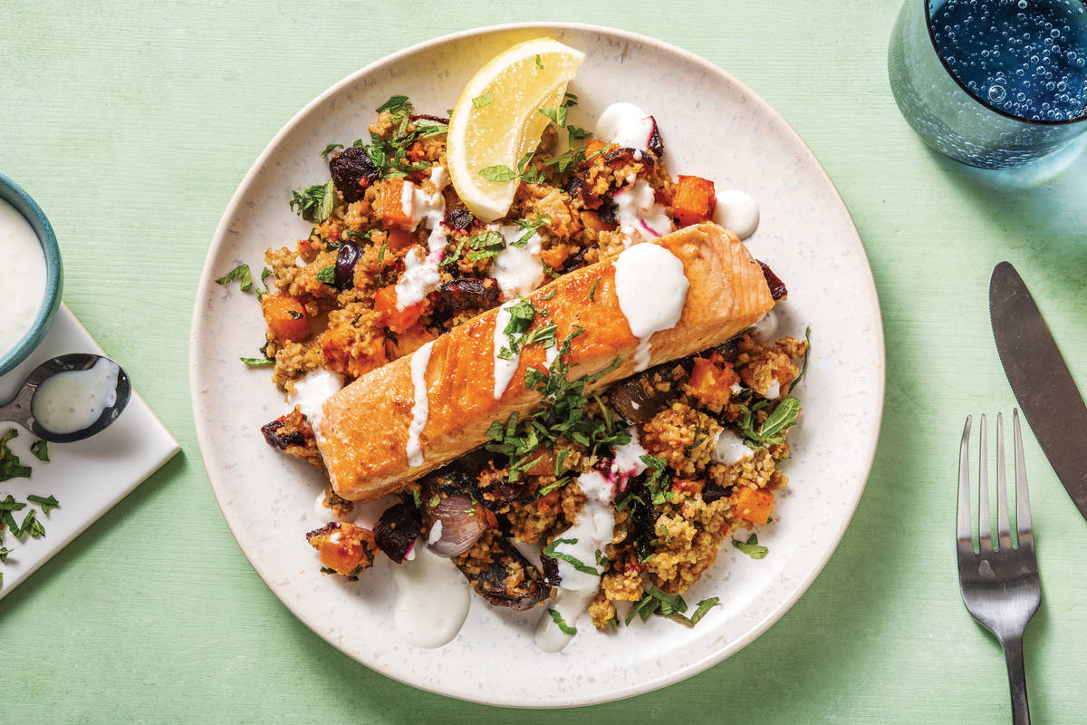 Divide the freekeh salad and seared salmon between plates. Drizzle with the lemon yoghurt, sprinkle with the reserved mint and serve with any remaining lemon wedges on the side.