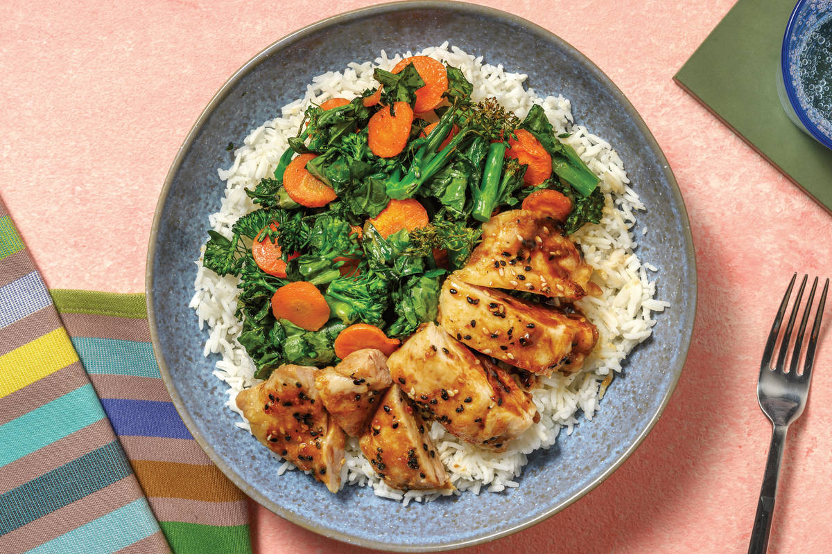 • While the rice is cooking, roughly chop baby broccoli and Asian greens. Thinly slice garlic. • In a small bowl, combine teriyaki sauce, the honey, soy sauce, peanut butter, the sesame oil and garlic. • To the oven tray, add baby broccoli, Asian greens and sesame teriyaki sauce. Toss veggies to combine. Sprinkle mixed sesame seeds over chicken. • Return to oven and bake until chicken is cooked through and veggies are tender, 8-10 minutes.