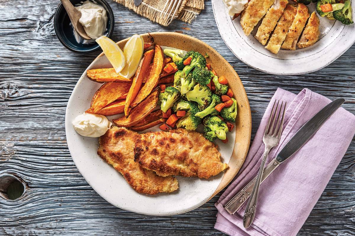 Add sweet mustard spice blend to pork for a flavourful schnitzel, then serve the moreish meal with kumara wedges and caramelised broccoli and carrot. This is a dinner plate that won't be forgotten.