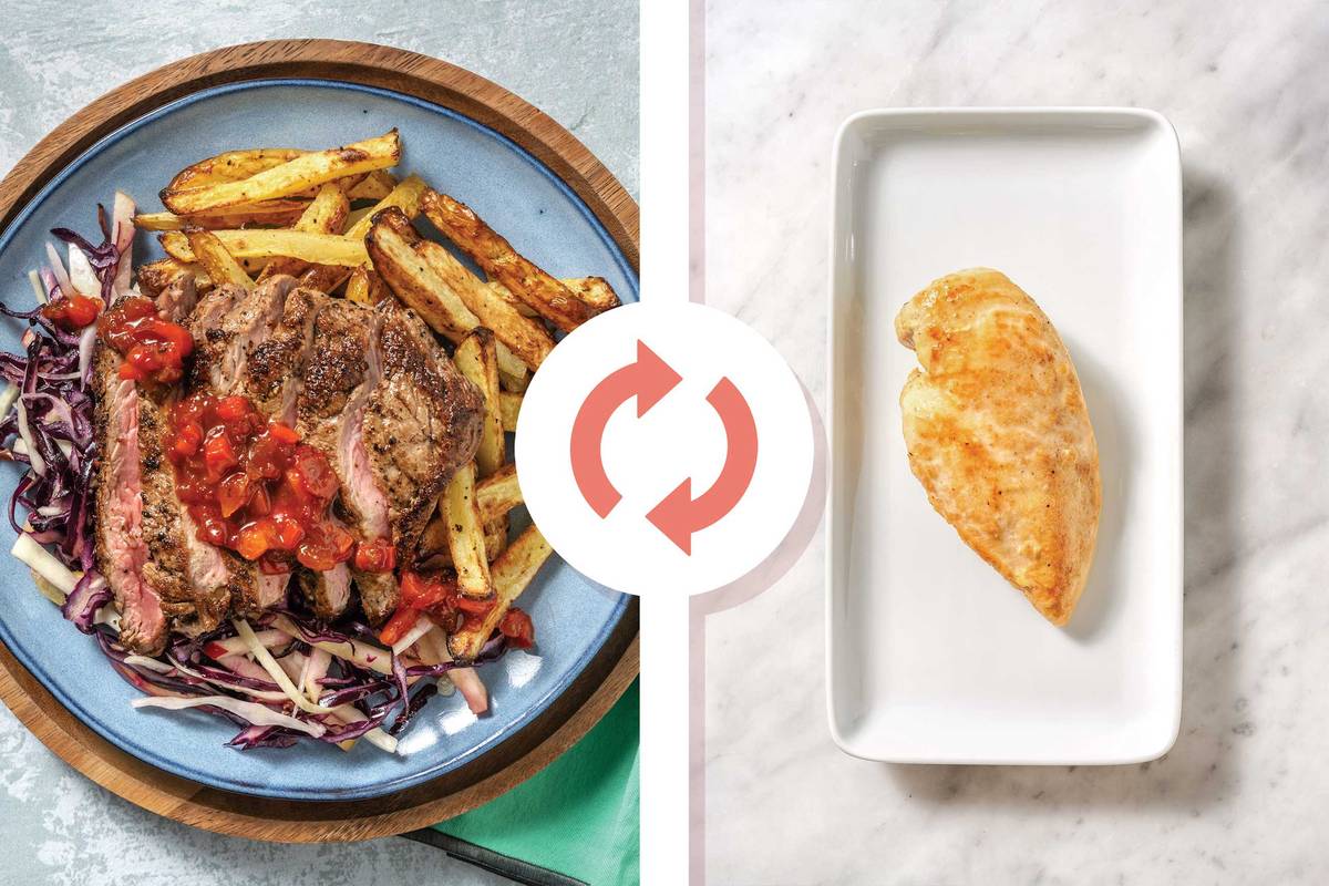 Custom Recipe: If you swapped to chicken breast, place your hand flat on top of chicken breast and slice through horizontally to make two thin steaks.