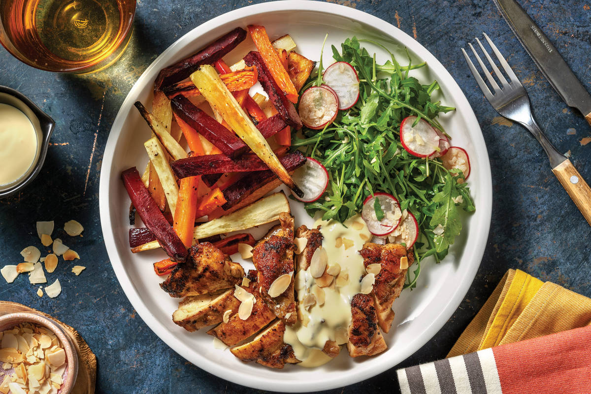 • Slice spiced chicken. • Divide chicken, rainbow veggie fries and Parmesan-pear salad between plates. • Spoon any resting juices over chicken. • Sprinkle over toasted almonds and serve with Hollandaise. Enjoy!