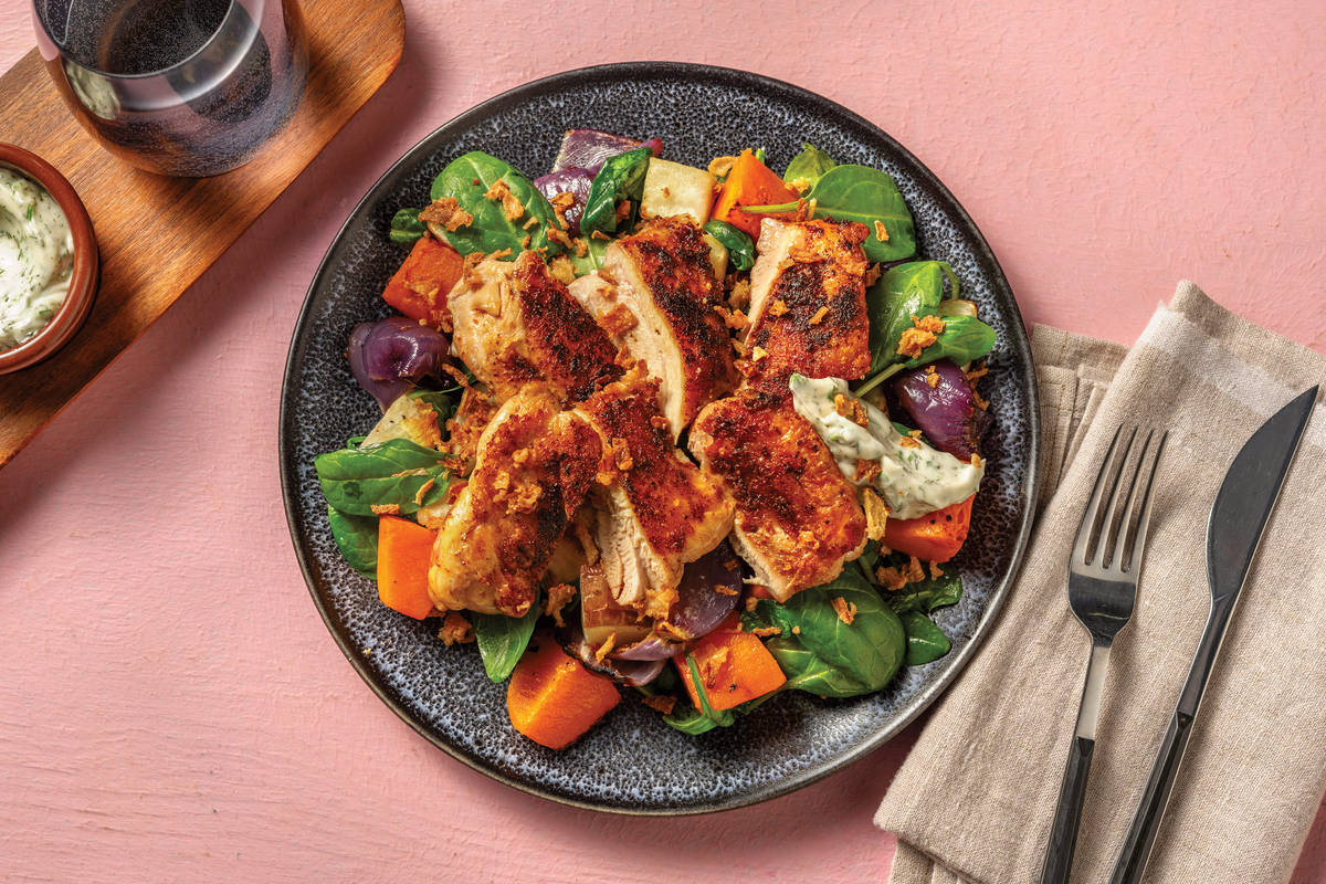 • Divide roast pumpkin toss between plates. Top with spiced chicken and haloumi. • Dollop over dill & parsley mayonnaise. Sprinkle with spring onion to serve. Enjoy!