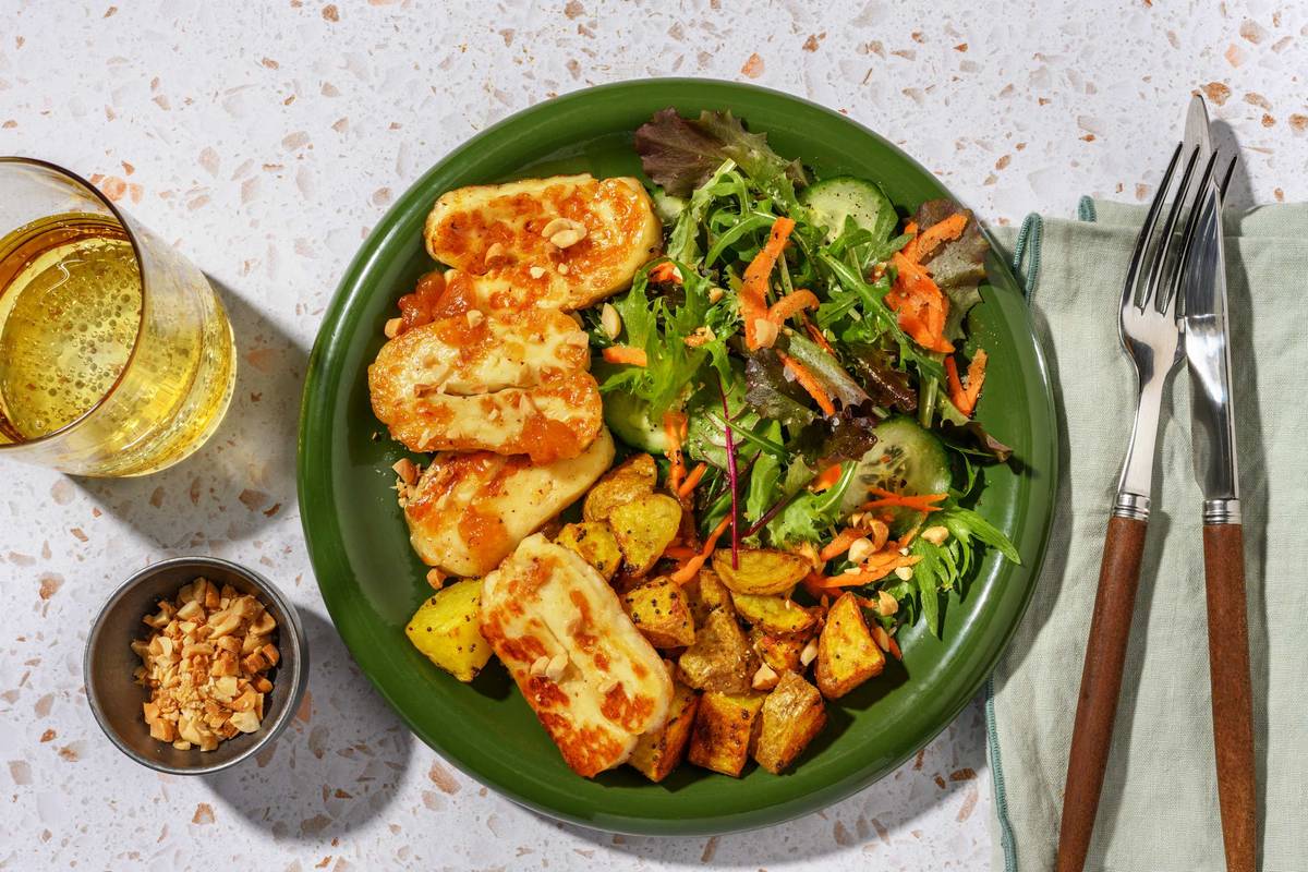 • In a large bowl, combine mixed salad leaves, cucumber, carrot and a drizzle of white wine vinegar and olive oil. Season. • Divide apricot-glazed halloumi, spiced potatoes and garden salad between plates. • Garnish with crushed peanuts and serve with garlic aioli. Enjoy!