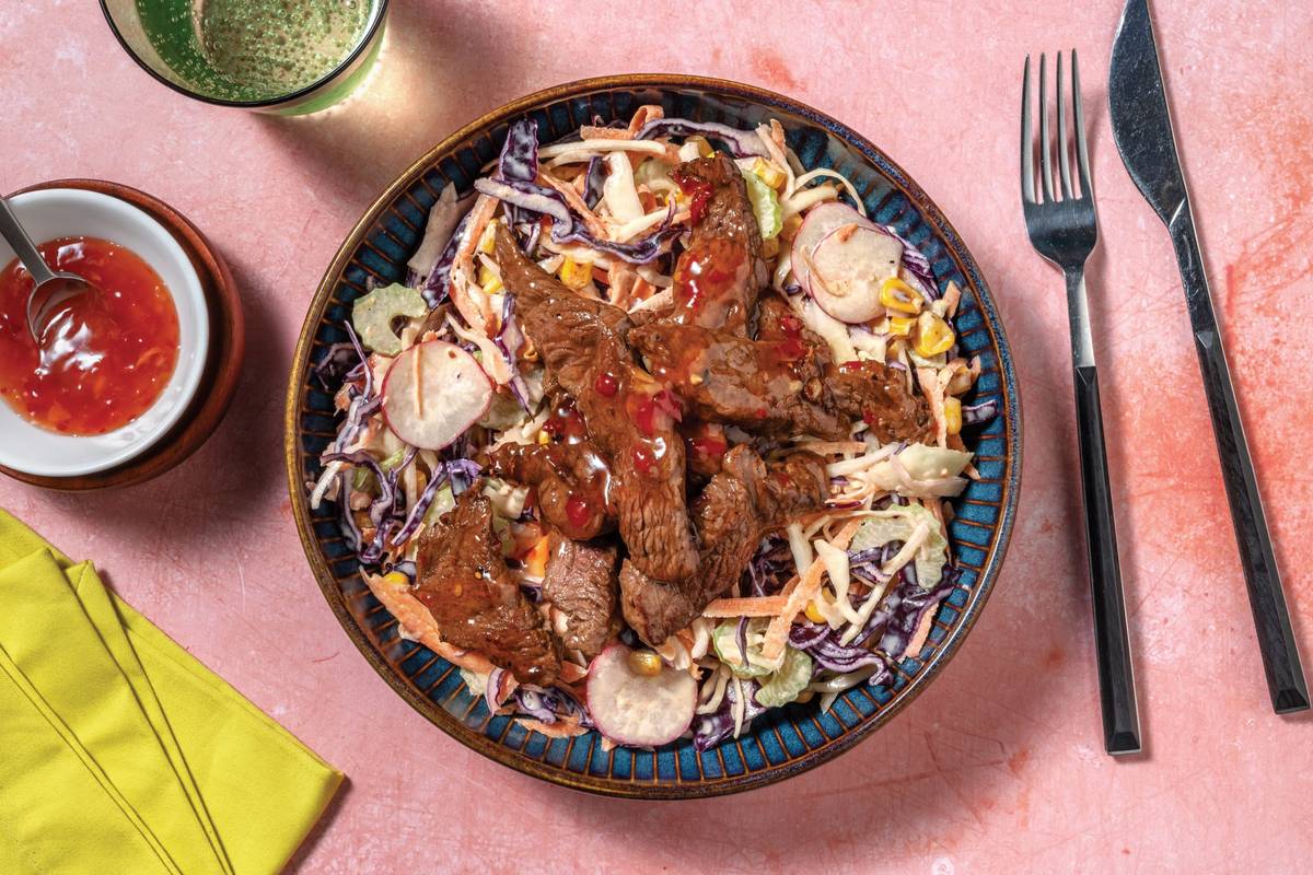 • Divide rainbow slaw between bowls. • Top with sweet soy-glazed chicken. • Spoon any remaining sweet chilli glaze over chicken to serve. Enjoy!