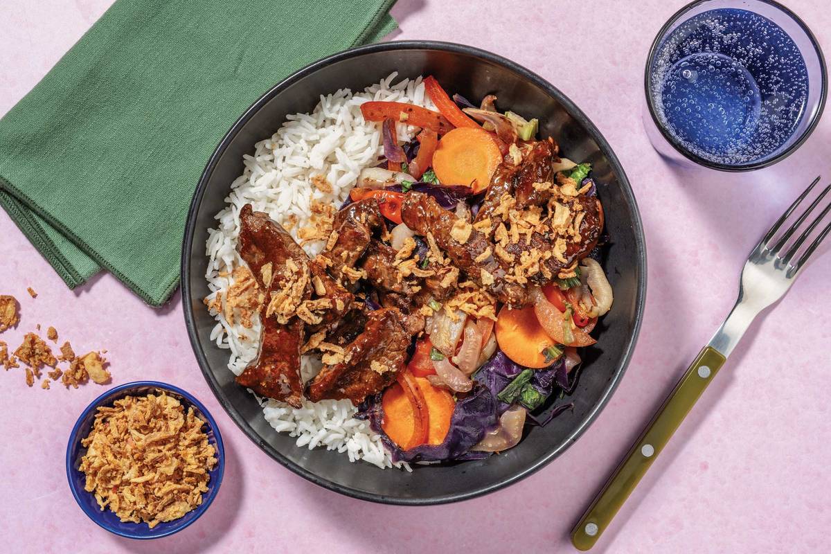 Custom Recipe: If you've upgraded your beef strip to beef rump, pound beef with a meat mallet or rolling pin until slightly flattened. Heat the pan as above. When oil is hot, cook beef, turning, for 3-4 minutes (depending on thickness), or until cooked to your liking. Add the ginger sauce mixture and cook for 1-2 minutes. Transfer to a plate to rest.