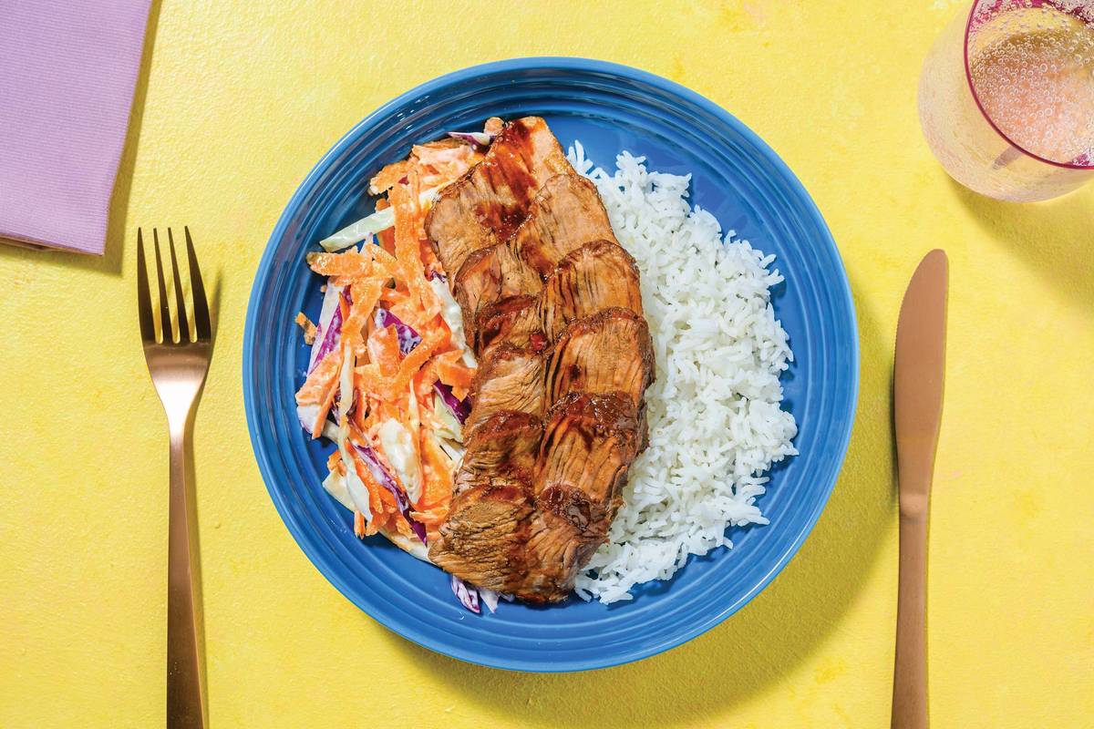 • Slice beef brisket. • Divide butter rice between bowls. Top with sweet chilli-glazed brisket and creamy sesame slaw. Enjoy!