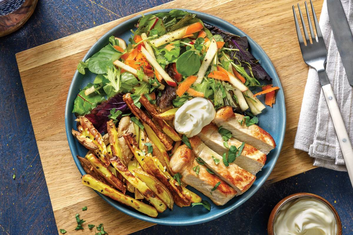 • Toss apple salad. Roughly chop coriander leaves. Slice teriyaki-glazed pork. • Divide sesame fries, apple salad and pork between plates. • Spoon over any remaining glaze from the pan and garnish with coriander. • Serve with garlic aioli. Enjoy!