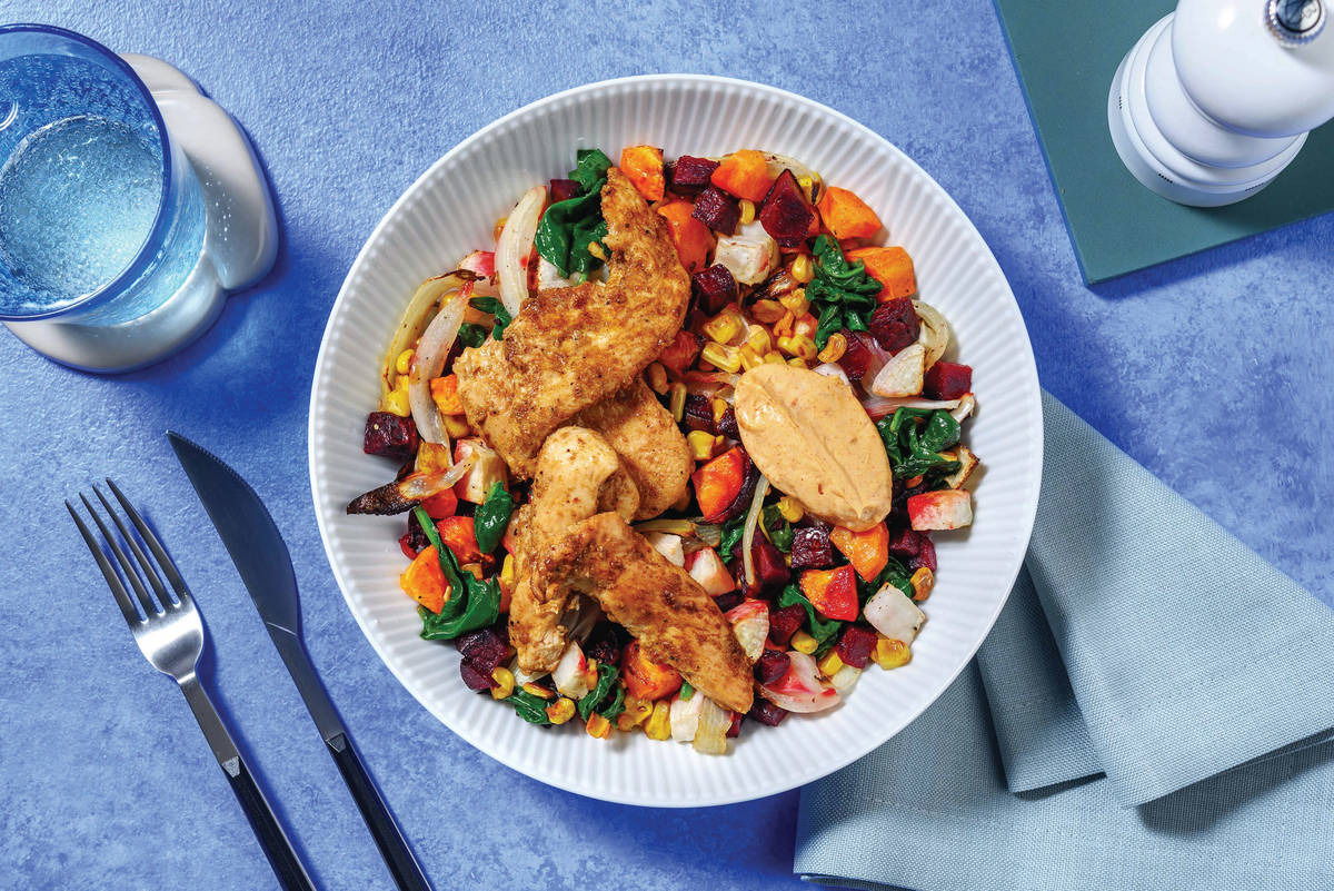 Get the bold flavours of American cuisine right in your kitchen! Just coat beef rump with our All-American spice blend, roast a chunky veggie toss and dollop smokey aioli over the whole shebang. *This recipe is under 550kcal per serving and under 40g carbohydrates per serving.*