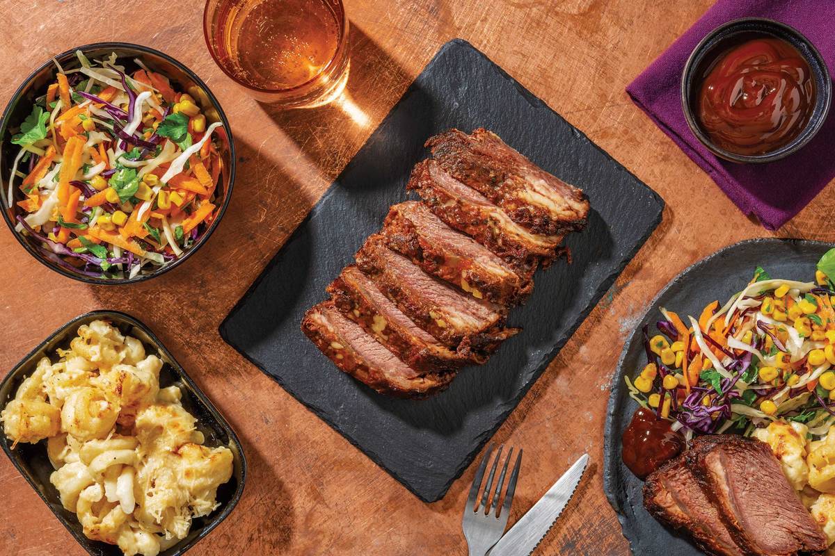 we've taken all the fuss out of this feast and injected loads of shining flavour with our smokey Texan-style beef brisket, that's already been slow-cooked to tender perfection. Stack the dinner table with all the fanciful fixings of cheesy orcchiette (reminiscent of mac 'n' cheese), crunchy slaw and BBQ sauce as marinade to complete tonight's star protein.